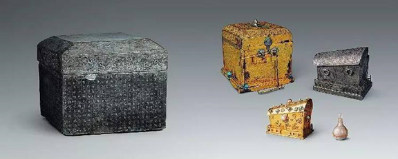大云寺舍利的第一次出土是1964年。在大云寺舊址,農(nóng)民在平整田地時意外發(fā)現(xiàn)了一個狀如古墓的地宮,地宮內(nèi)發(fā)現(xiàn)一個青石雕刻的石函,石函頂蓋赫然刻著16個大字--“大周涇州大云寺舍利之函總一十四?!薄I崂?層,依次有石函、鎏金銅匣、銀槨、金棺、琉璃瓶,瓶中盛有記載的那14粒佛舍利。五重套函,在中國還是第一次發(fā)現(xiàn),級別之高,制作之精美,令人嘆為觀止。