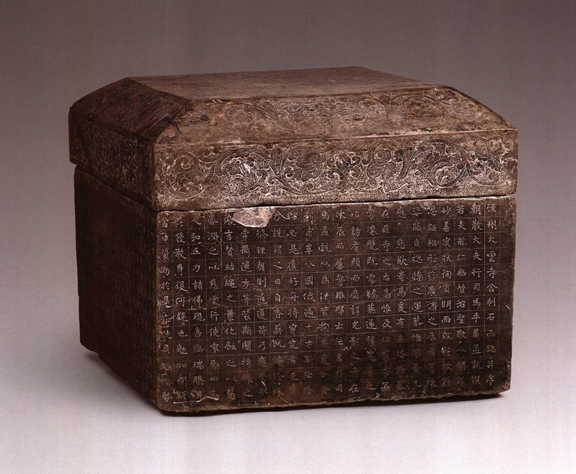 第二次出土是1969年冬。在距離第一次出土不遠(yuǎn)的地方,又出土了一個石函,函蓋刻有“比丘慧明造舍利石函”,函體正面陰刻楷書銘文104字,落款為“大周天和二年”。據(jù)石函銘文介紹,北周天和二年,即公元567年,當(dāng)時涇州寶寧寺和尚慧明為佛祖造像時,將佛像和佛舍利一起供養(yǎng),以實現(xiàn)俱登正覺的宏愿。這次出土的石函內(nèi)有大小銅函,內(nèi)有琉璃瓶,共十粒舍利。這次出土也將古涇州大云寺的舍利供養(yǎng)史,提前到北周早期。