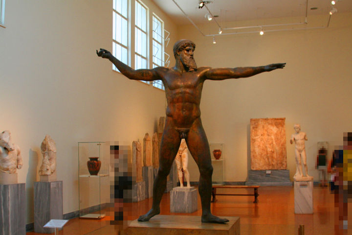 該照片攝于希臘國(guó)家考古藝術(shù)博物館,我們看到所有的陶瓶都被放置與展柜空間中,所有的青銅、大理石材質(zhì)的雕像都放在開放空間中,沒有設(shè)置展柜。