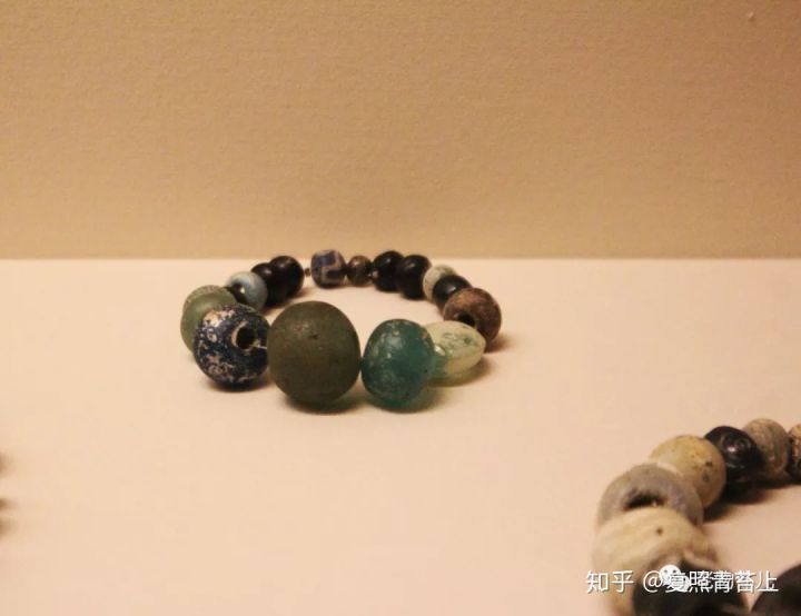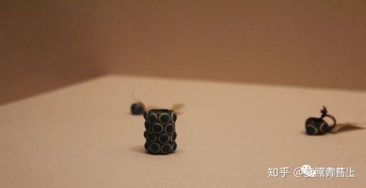 仔細(xì)看這幾串 “蜻蜓眼” 玻璃珠,有一些表面可以清楚的看見(jiàn)斑點(diǎn)或產(chǎn)生各種顏色的沉積垢層(白色和土黃色為主),這層沉積物是玻璃在腐蝕過(guò)程中與周?chē)镔|(zhì)發(fā)生作用產(chǎn)生的不溶性鹽沉淀物。因環(huán)境不同,產(chǎn)生的鹽也不同。