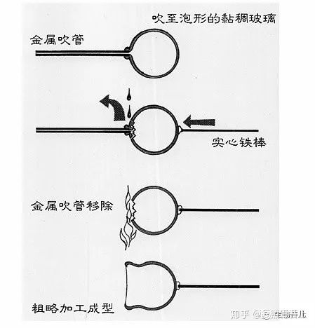 吹制法是指用吹管把料泡吹成適當(dāng)形狀和大小,料泡的內(nèi)部與外部接觸空氣降溫,形成彈性表皮,并以熟練的手法使其產(chǎn)生雛形,然后將已經(jīng)成型的玻璃容器從空心的吹管上轉(zhuǎn)接到末端帶有少量黏稠玻璃液體的實(shí)心鐵棒上,最后再將玻璃器從實(shí)心鐵棒上剪除取下。