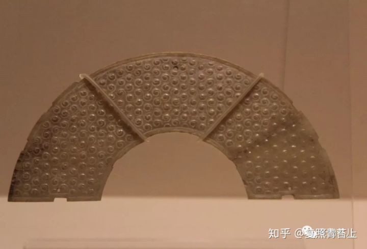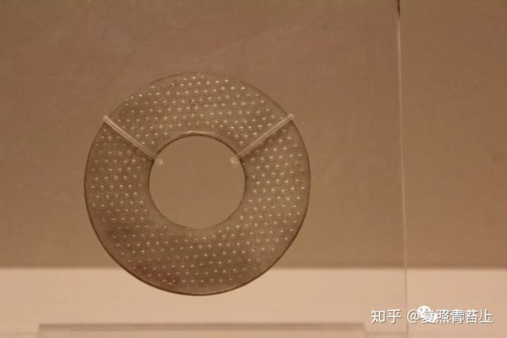 這件玻璃璧色澤、器型、紋飾即均模仿玉璧;豆青色,中間有圓孔,正面谷紋縱橫成行,排列有序。