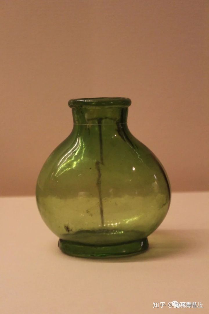 這件橢圓形綠玻璃瓶器形比較特殊,其質(zhì)地和工藝水平已接近西亞玻璃,但同時(shí)期的西亞并沒(méi)有出土過(guò)相似器形的玻璃瓶,很可能是受當(dāng)時(shí)國(guó)內(nèi)流行的瓷扁壺影響(如:河南安陽(yáng)北齊范粹墓出土的黃釉樂(lè)舞圖扁壺。此藏品在中國(guó)國(guó)家博物館地下一層《中國(guó)古代》去看展的時(shí)候,可對(duì)比一下。)