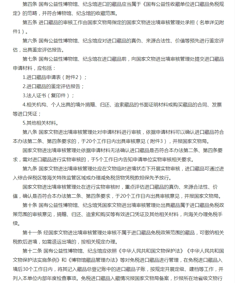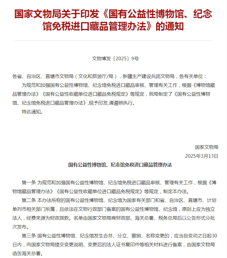 國家文物局印發(fā)《國有公益性博物館、紀念館免稅進口藏品管理辦法》